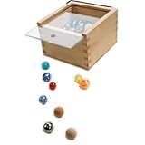 Contents: 84 colored marbles, 6 balls each of wood, rubber, cork, and steel, 6 blue, 6 yellow, 6 green, and 6 red balls, wooden box with sliding acrylic lid.Made of untreated beech wood with acrylic lid. Wipe with dry cloth to clean. Not intended for use by children under three years old. Small parts may pose a choking hazard for young children. Supervised play recommended.