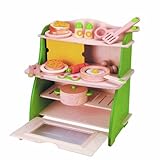 Teach your little one the joy of cooking with this kitchenette. What will your small chef make for diner tonight? We love the soft rattle of the salt and pepper shakers. Also great is the smooth feel of the wood.Included with the kitchen: 2 plates 2 forks 2 knives 1 spatula 1 serving spoon 1 saucepan with lid 1 skillet 1 salt shaker 1 pepper shaker 1 fried egg 1 pizza 1 carrot (splits into halves) 1 cheese slice 2 mushrooms 1 loaf of bread (splits into 4 slices)Made of wood with completely non-toxic, child-friendly paints and finishes. Ships flat. Some adult assembly required. Not intended for children under the age of 3.